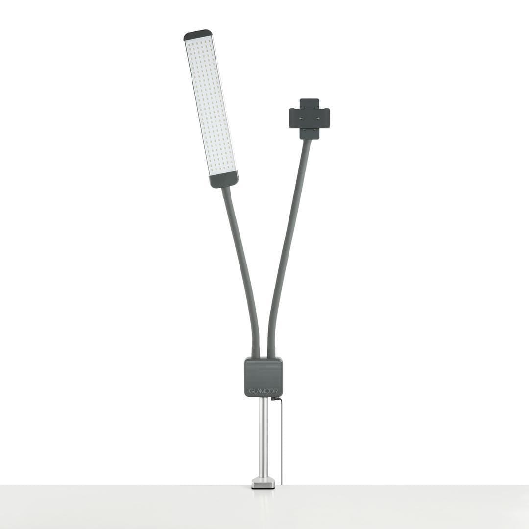 Glamcor Capture viene con un panel de luz LED con cinco etapas de atenuación y un soporte para teléfono, ambos unidos a una abrazadera de mesa para una iluminación preciosa y mejores ángulos de cámara.